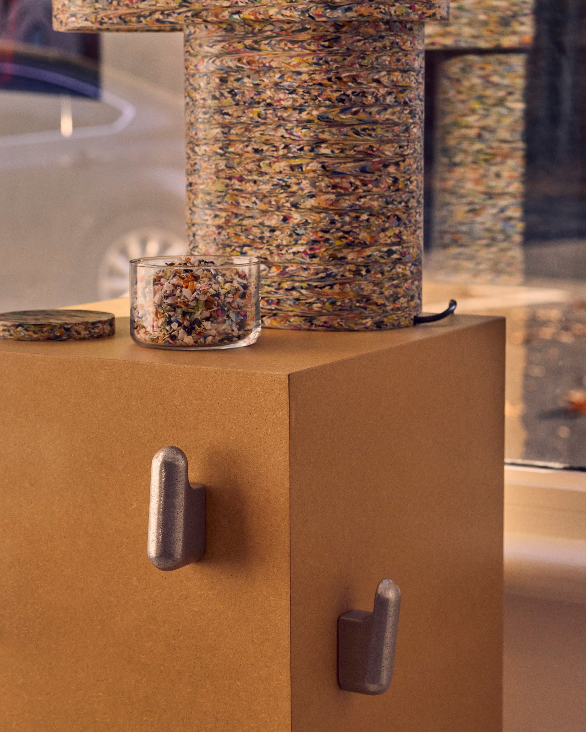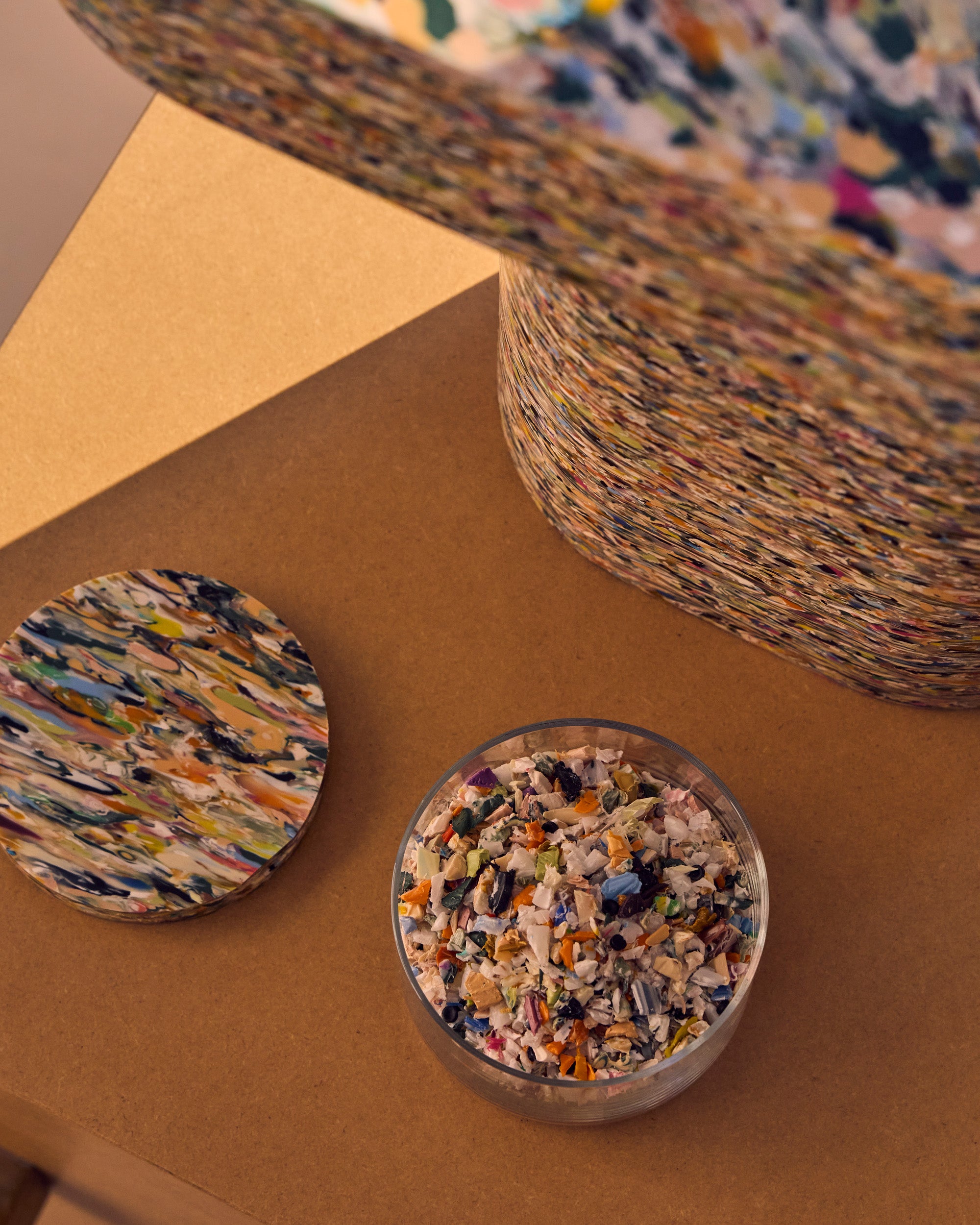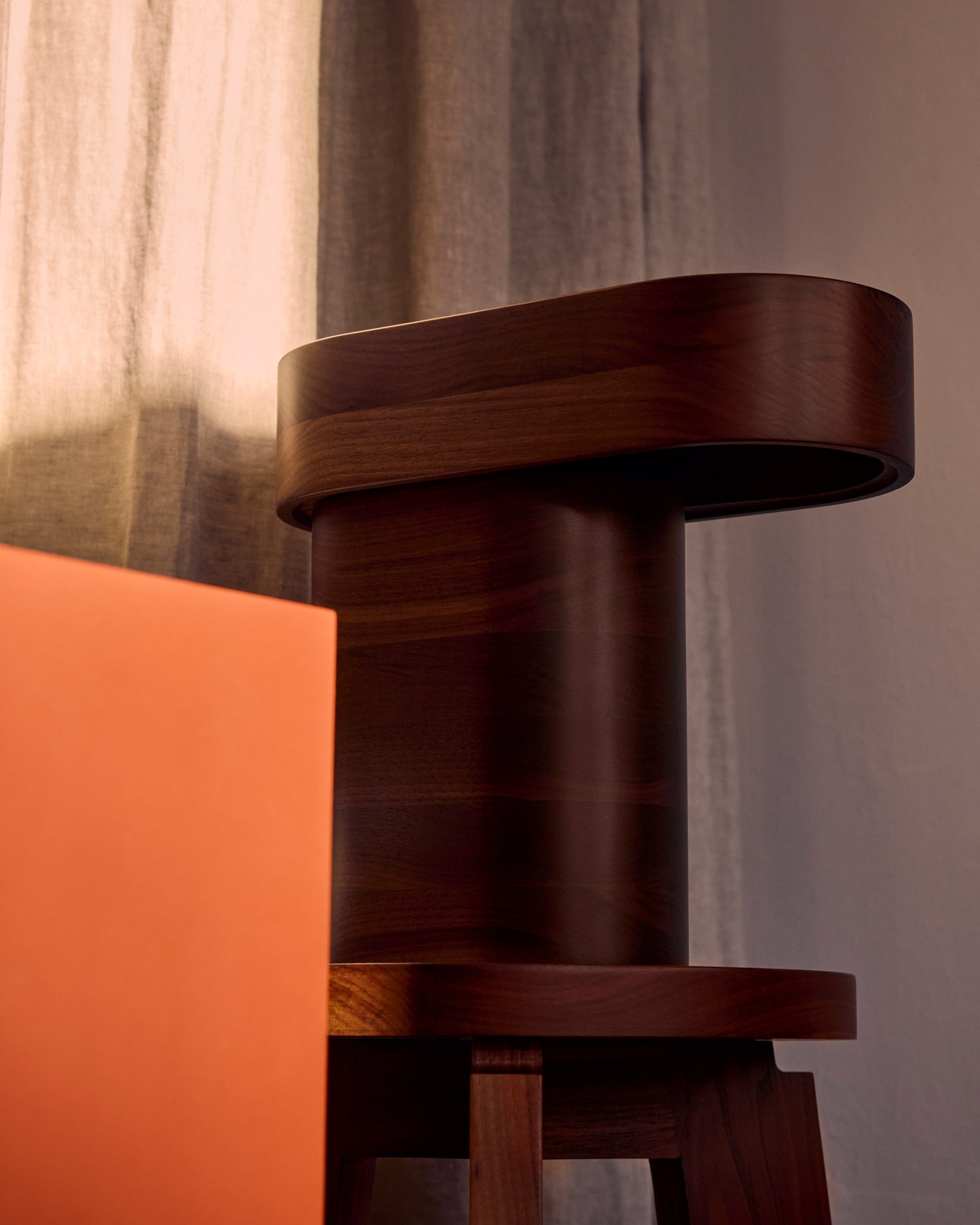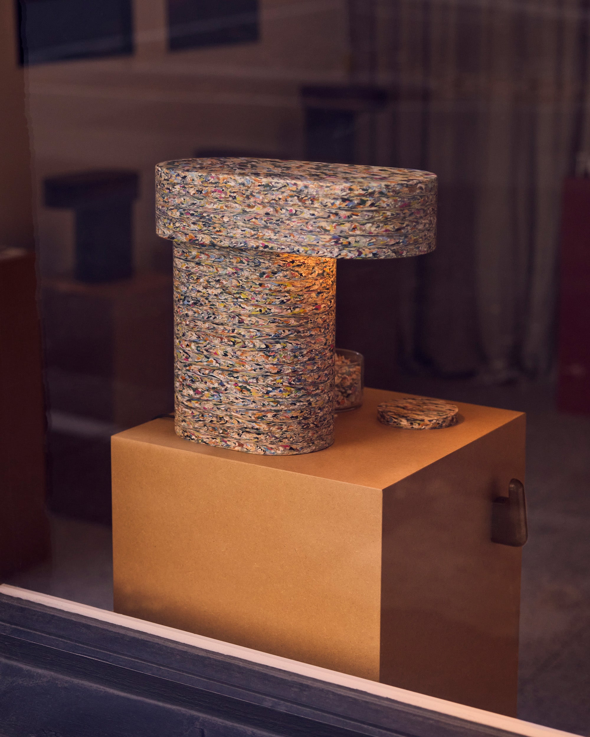 Each piece is made from either sustainably sourced walnut or CNC-cut layers of 100% locally sourced recycled plastic, stacked and fixed to form a unified, stratified composition. Whether expressed in warm timber or recycled material, MASS holds a quiet power: a luminous volume that shapes its surroundings both physically and perceptually.