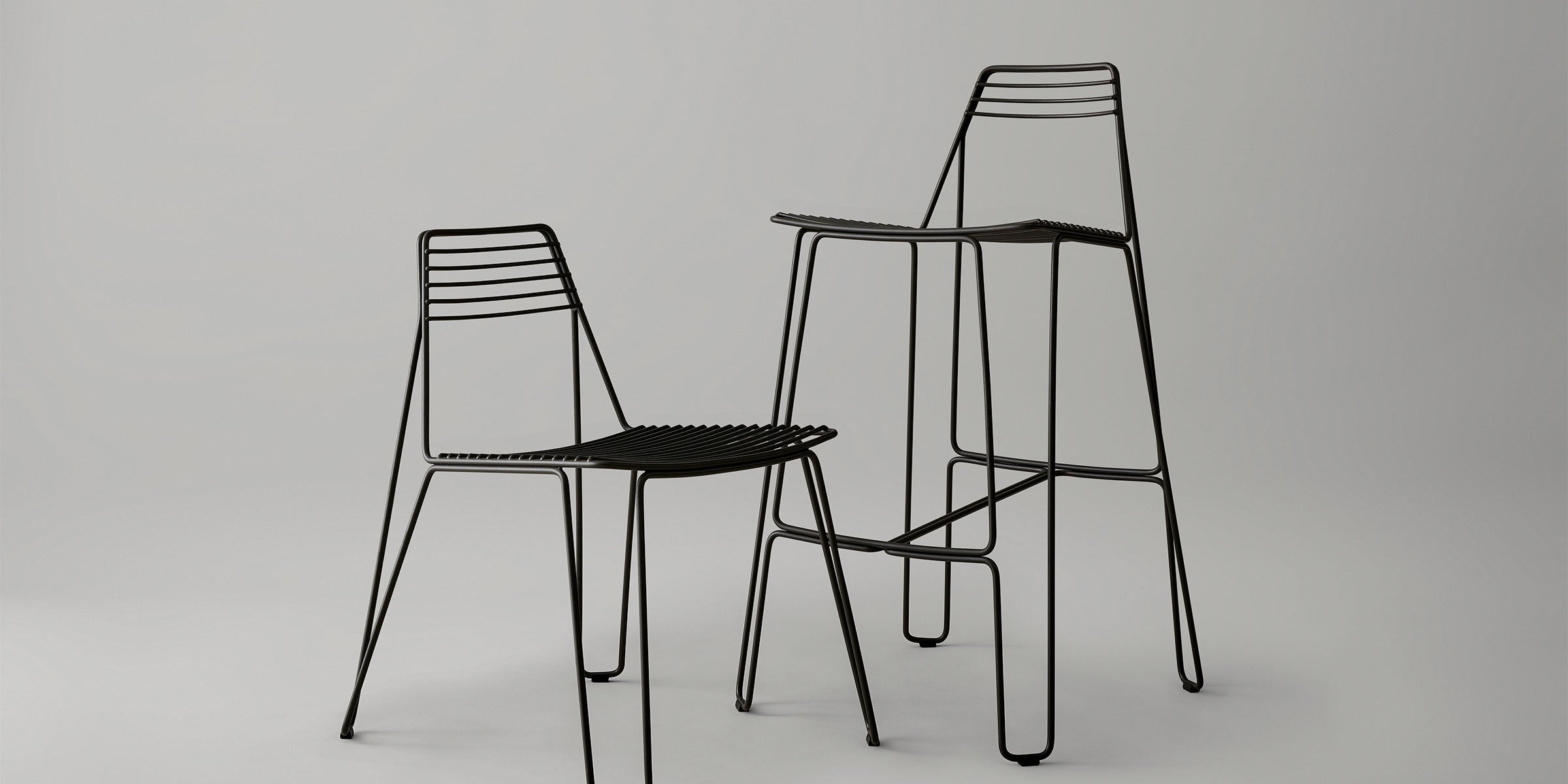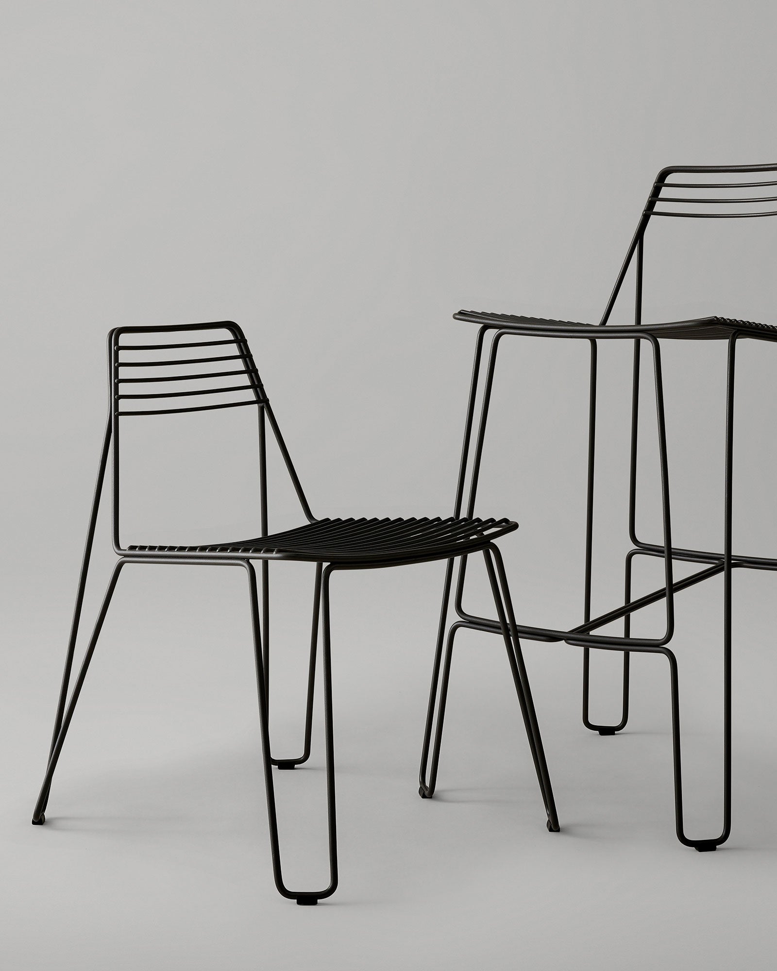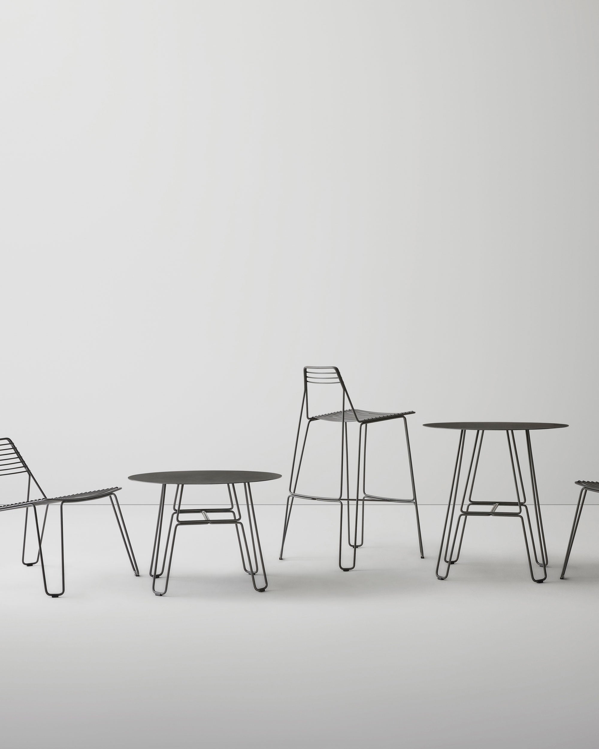 The TUIN collection includes a Dining Chair, Lounger, Low Stool, Counter Stool, and Bar Stool, as well as a Low Table and Café Table with slimline steel tops, designed for use both indoors and outdoors. Custom table top and powder coat options are available to suit your specific project needs.